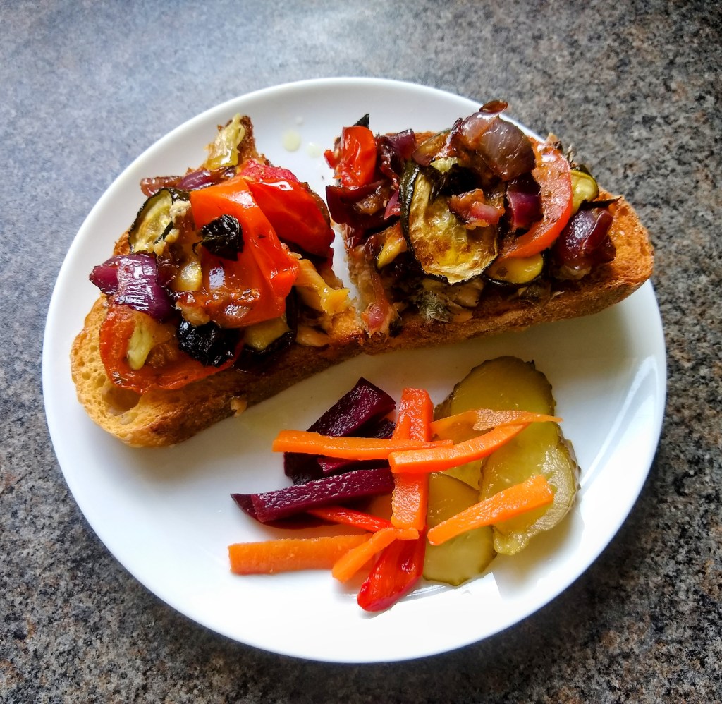 A quick yet satisfying meal using prepared vegetables, tinned sardines and a crusty slice of bread. The richness and sweetness from the oil and vegetables pairs beautifully with the intense salty savouriness of the fish, while the sharp tang of pickles or a dressed salad brings an acidic note to cut through the dish.