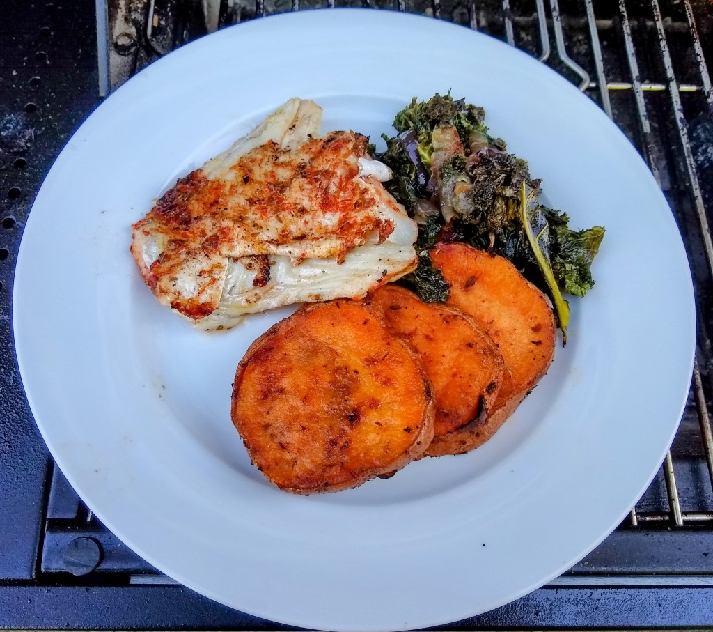 Since the fish and vegetables can be a bit delicate you’ll probably find it easier if your grill has a griddle plate or wide bars, but failing that you can get mats that provide a flat surface over the grill or just use a baking tray or cast iron skillet on top of the grill.