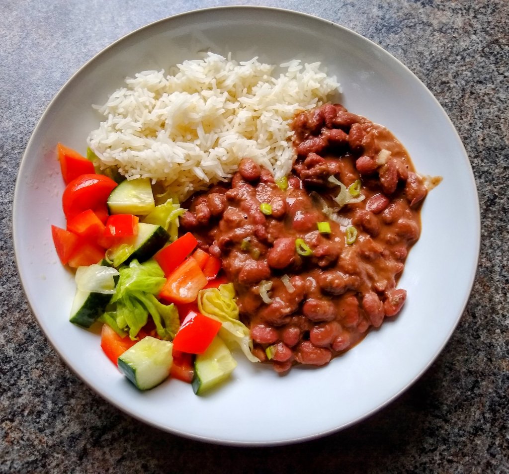 Simple, satisfying and flavoursome, this is a dish I love to have in the freezer to reheat when I’m craving something comforting and filling. You can of course do this with other types of beans and different flavours too, for instance black beans works well with a bit of allspice and cumin, or mixed beans with some Mexican spices. I’ll have some more recipes of the many variations of these types of dishes in the future. Variations of different meats are used across the region as well, so use whatever you have access to and what’s good. Just note if you’re using some sort of ham they can often be quite salty, so soak them in a bit of water first or adjust your seasoning accordingly.